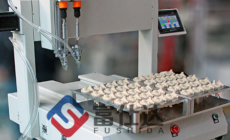 产品有三颗螺丝需要紧固,为了提高生产效率,这里采用富 仕达双工位,双平台坐标式自动锁螺丝机。