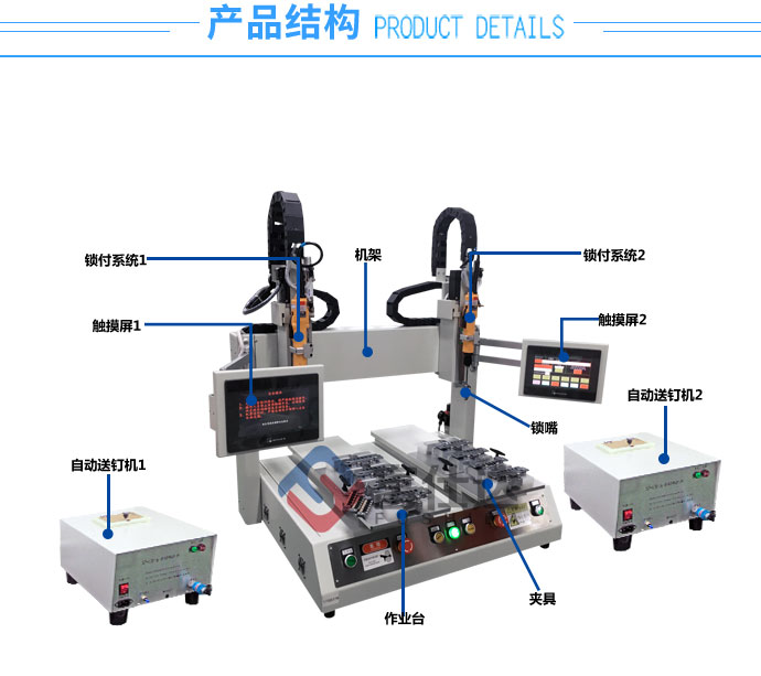 双系统坐标式锁螺丝机具有坐标式所有优点,不同的是双锁付系统采用两台独立的自动送钉机和电批,分别用PLC控制各自电批的工作路径,一台设备可同时完成不同产品的螺丝锁付工作,也可完成同一产品不同部位螺丝的锁付工作,设备功能与普通坐标式自动拧螺丝机类似,搭配触摸屏即可操作,可自行更改锁付路径。设备功能更完善。