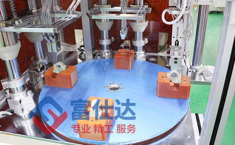 多轴双锁付系统自动拧螺丝设备工作原理:设备采用富仕达转台式拧螺丝方案,具有转台式自动拧螺丝设备的所有功能,设计双锁付机构,员工将待拧螺丝的产品放置在夹具上后,设备通过转盘将产品送至第一道拧螺丝工序,一次同时输送并自动拧好按摩器轴卡子上的4颗螺丝,员工继续放置产品,同时转台将拧好第一道工序的产品送至第二道工序,一次输送并自动拧好按摩器轴卡子上面的2颗螺丝,再转到下一工位将锁付好的产品由机械手取出,完成产品作业。整个过程维持同步圆周作业,员工只需要不停放产品即可。