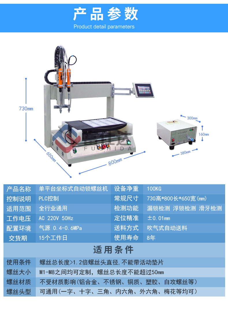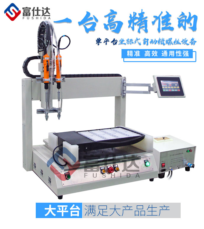 富仕达单平台自动锁螺丝机是指单平台坐标式自动锁螺丝机,通常用在面积较大产品,如:写字板、大家电、天花吊顶、大型玩具及大型LED模组等。