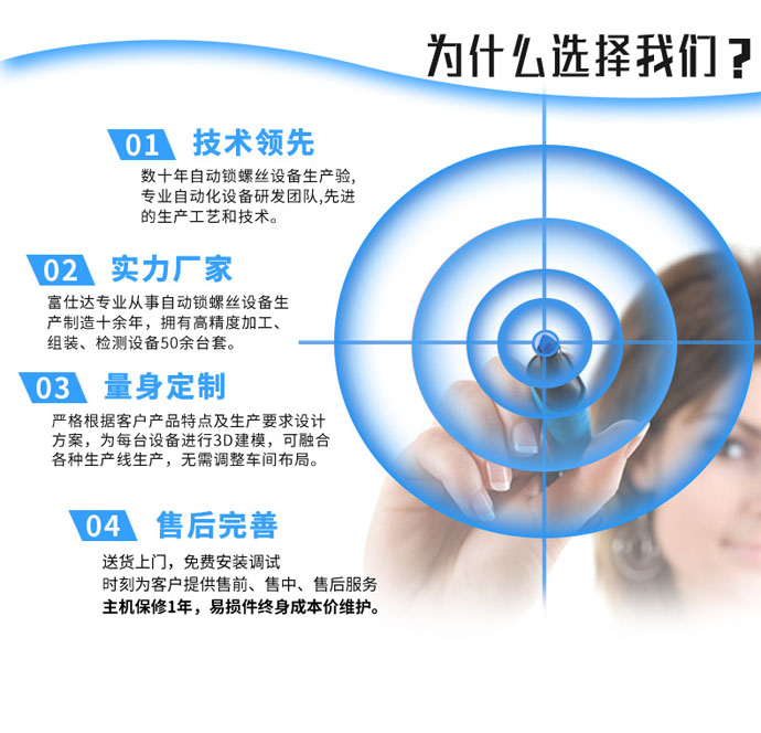 富仕达拥有独立研发设计团队,10多位自动化高级工程师,5000㎡自动锁螺丝机生产、测试车间,专业售后服务团队,为客户提供方案设计、设备制造、操作培训、售后服务等一站式服务。 公司将持续提升技术创新和产品服务方面的优势,坚持“专业、精工、服务”的企业理念,聚焦于自动锁螺丝设备生产,通过系统的一站式解决方案,真正的帮助客户提升效率、降低成本,提升客户的核心竞争力。